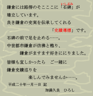 ◆石碑は、「鎌倉町青年会」が大正6年(1917年) 以降、昭和20年初頭までの期間に建碑された ものであります。 呼称が異なっています。) 「中世の鎌倉」を見直し、史蹟保存の運動は、 古都鎌倉を深く愛する有志の結晶であります。 88箇所の各々の石碑にはその情熱の高さが 刻まれて、現在に中世の事象を伝えてくれます。 喜ばしい限りです。更に後世に伝えて行きたい。 ⇒ 石碑の『 建立年次一覧表 』を参照されたい。 |